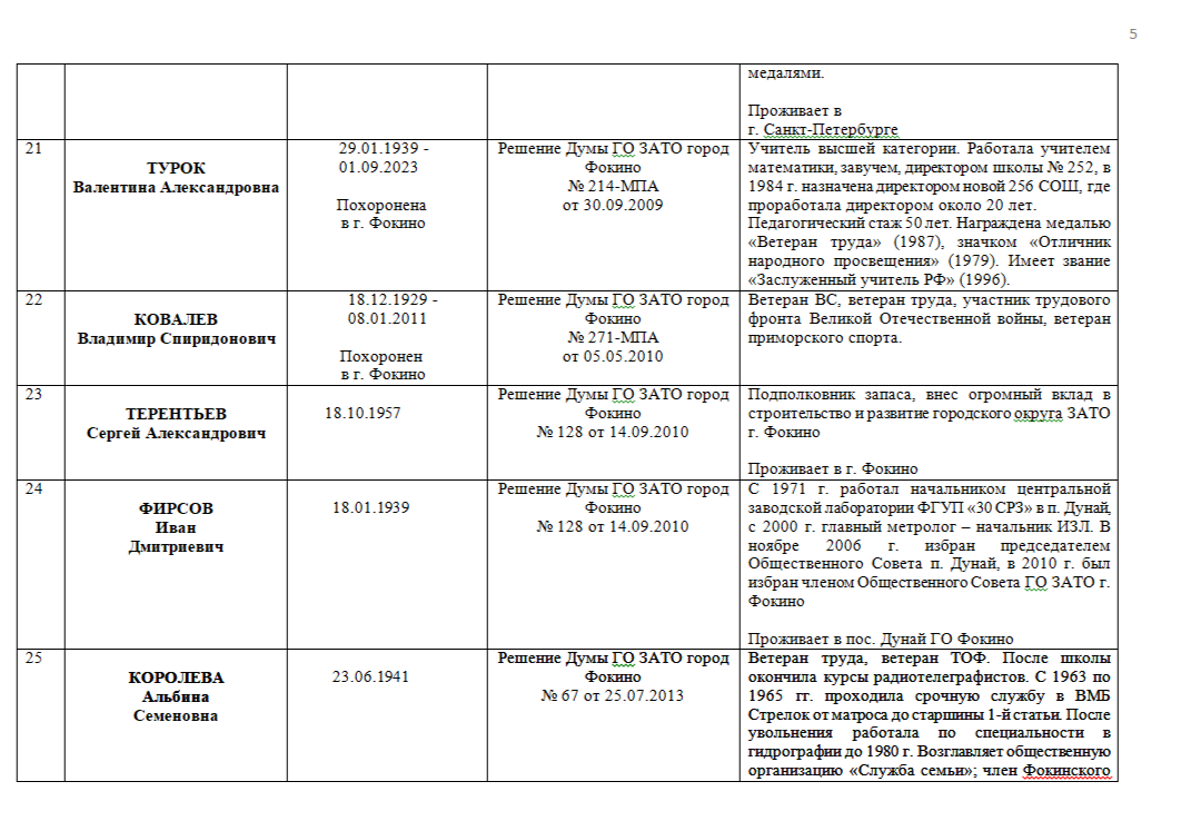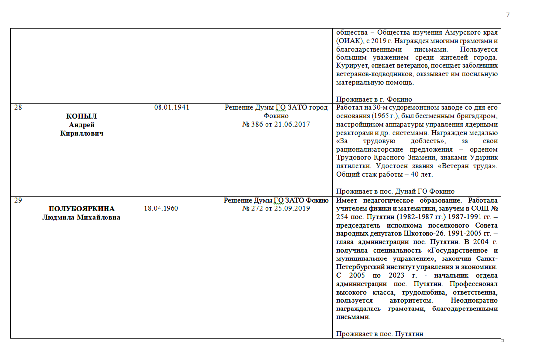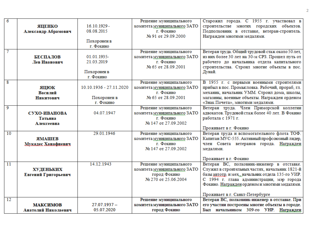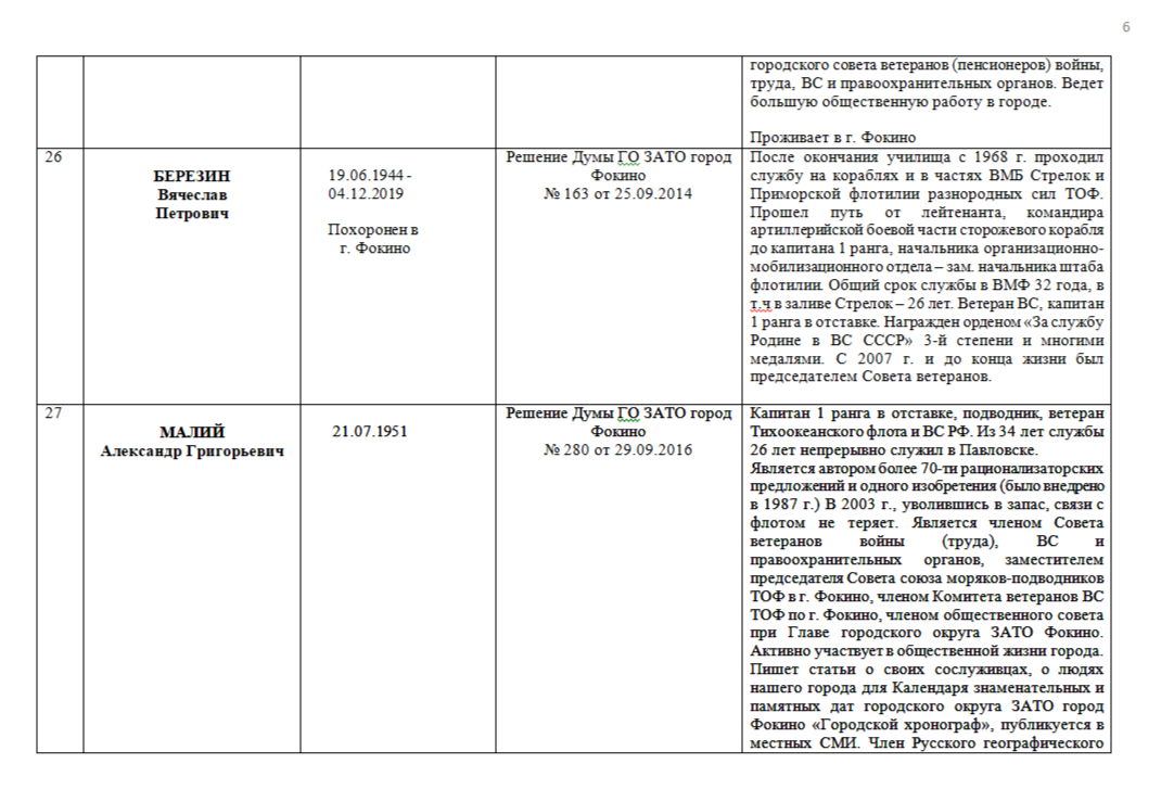 ПОЧЁТНЫЕ ГРАЖДАНЕ ГОРОДСКОГО ОКРУГА ЗАТО ФОКИНО